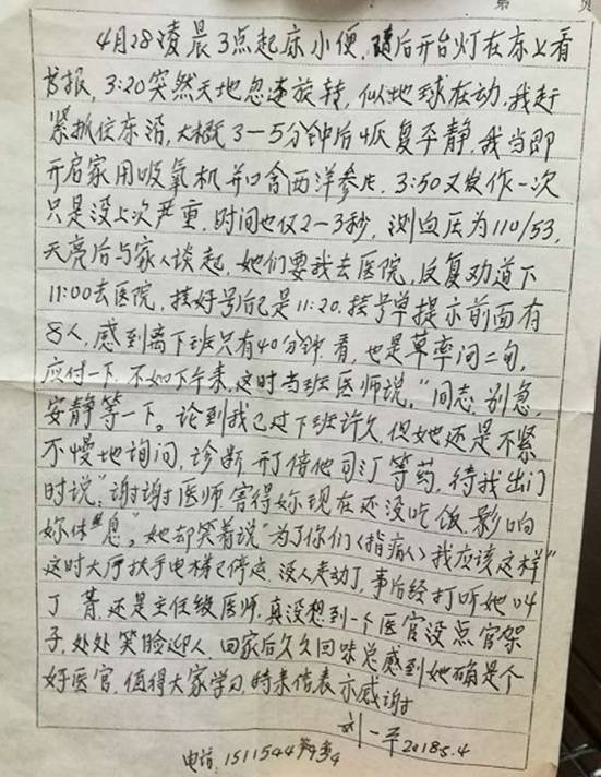 一封老人的感謝信 發(fā)布時間:2018年5月4日 預(yù)覽:11237次 5月4日上午,一位退休老人步履艱難地來到門診辦公室,述說了他前幾天來門診看病的感動。他遞上感謝信后一再叮囑要求門診負責人給予表揚,述說時還熱淚盈眶。下面老人家寫給神經(jīng)內(nèi)科門診醫(yī)師丁菁主任的信: 劉一平老人不辭辛苦,病情好轉(zhuǎn)后特地趕來醫(yī)院門診向4月28日看門診的丁菁主任表示感謝。