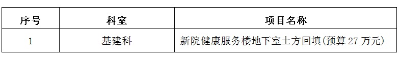 我院擬于近期采用公開(kāi)招標(biāo)方式對(duì)新院健康服務(wù)樓地下室土方回填進(jìn)行公開(kāi)招標(biāo),歡迎具備條件并有意向的單位報(bào)名參加。